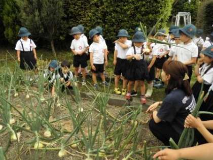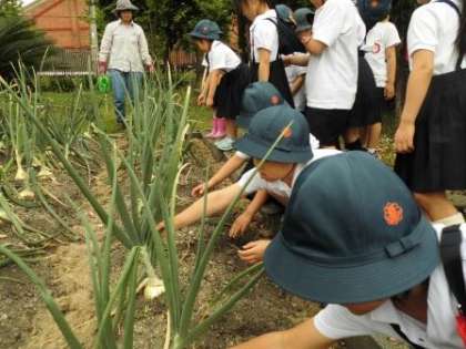 5月24日(水)、1年生が学習園で「玉ねぎ」の収穫をしました。歓声をあげながら、一つ一つやさしくていねいに掘り出していました。大きくて立派な玉ねぎでした。