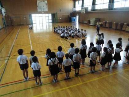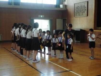 7月6日(木)5時限目、6年生が1年生から「ありがとうの会」に招待されました。1年生は6年生の人から、給食の手伝いなどいろいろなことをしていただきました。今日はそのお礼に、6年生の人に金メダルを贈り、ゲームをいっしょに楽しみました。6年生の人からは合唱・縦笛演奏のプレゼントがありました。1年生からもらった金メダルを胸にかけ、笑顔いっぱいの6年生の姿が印象的でした。