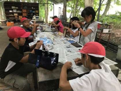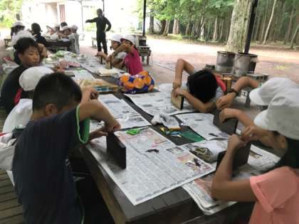 磨き終わった板に、金具と板を吊るすひもをつける作業です。