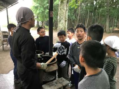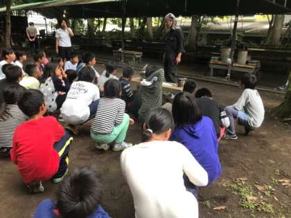 飯ごう係、野菜切り係、火起こし係に分かれて作ります。まず説明を聞きます。