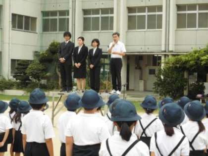 9月4日(月)、児童朝会の様子です。9月1日(金)から1か月の間、3人の先生が、1・4・5年で教育実習を行います。今日は、3人の先生から自己紹介をかねてお話がありました。