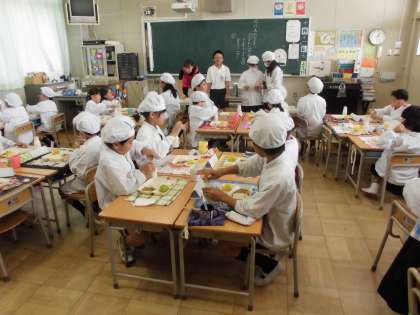 1年生は5年生と、2年生は4年生と楽しく給食をたべました。