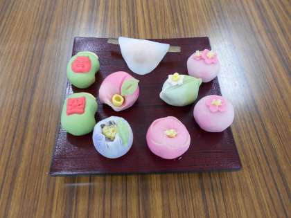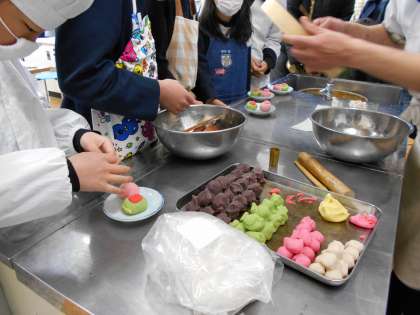 5年生は、特別講師として和菓子職人の方に来ていただき、和菓子作り体験をさせていただきました。子どもたちは、鬼や花の飾りをつけて1人2個の和菓子を作りました。