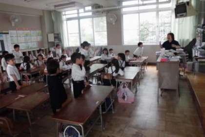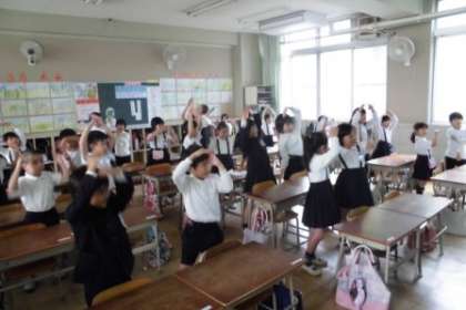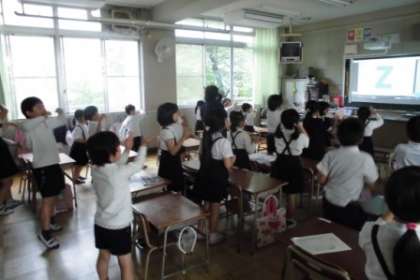 昼の時間帯を活用した2年生の英語学習の様子です。教材に合わせ、動作化したり、アルファベットを発音したり、楽しんで学習に取り組んでいます。