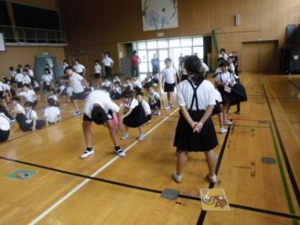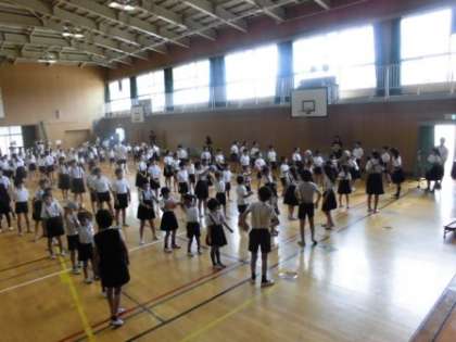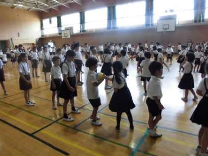 6月28日(木)、児童集会の様子です。今日は、ボール送りゲームをしました。たて割り班で、いろいろなボールの送り方に挑戦しました。