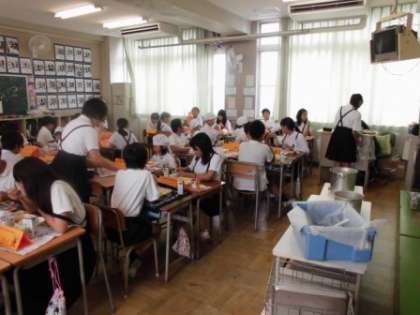6月29日(金)、交流給食を行いました。異学年間の交流を深め、楽しい会食をすることを目的にして、毎年実施しています。給食委員会の児童が○×クイズをしたり、グループで話をしながら食べたりして、楽しい一時を過ごしました。