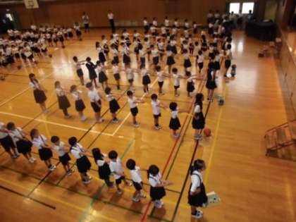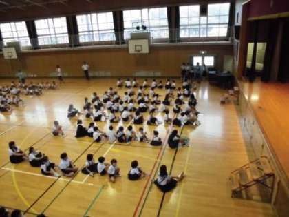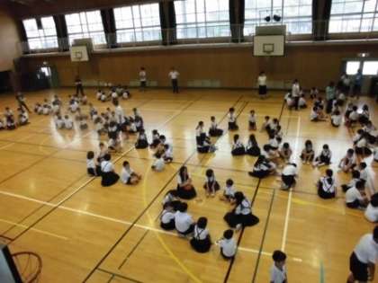 今日の児童集会の様子です。今日は、「ばくだんゲーム」をしました。音楽が流れている間にボールを回して、音楽が鳴りやんだ時にボールを持っていた子がアウトになるゲームです。少しでも早くボールを回そうとする子、ボールを持ったままでなかなか回さない子など、なかなか奥の深いゲームです。