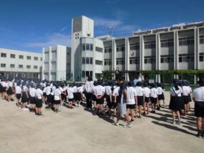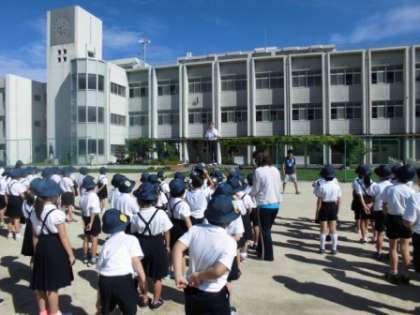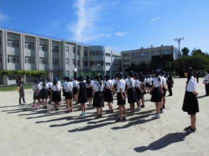 久々の快晴の中行った、児童朝会の様子です。校長先生、看護当番、生活指導の先生方から、学校生活に関わるお話がありました。