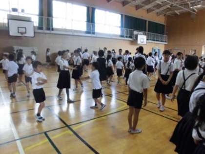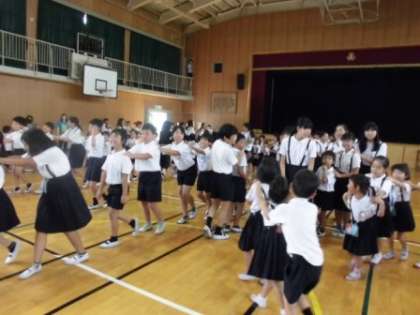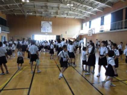 今朝の児童集会の様子です。今日は、「じゃんけん列車」をしました。みんなでじゃんけんをして、負けた人が勝った人の後ろにつながっていくゲームです。歓声を上げながら楽しみました。