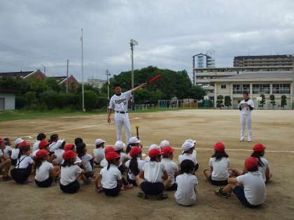 オリックスバファローズの方が学校に来られて、Tボール野球を指導してくださいました。「スポーツは勝つことも大切だが、みんなで協力してがんばることも大切だ。」とお話ししてくださいました。