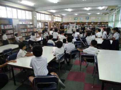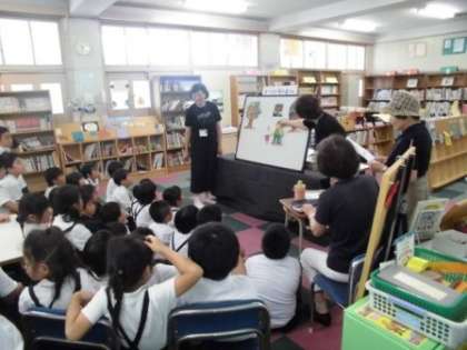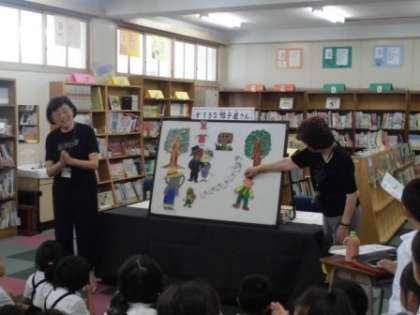 1学期最後のお話会の様子です。今日は、「すてきな帽子屋さん」という話をパネルシアターでしていただきました。パネルシアターというのは、パネルに登場人物などを張りながら、話を進めていくという読み聞かせの方法です。音楽演奏も交えてのお話で、子ども達も楽しんでいました。