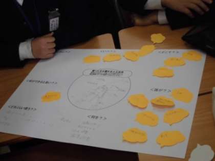 今日の2時限目、6年生が3回目のキャリア教育学習を受けました。今日は、グループに分かれ、話し合い活動を通して課題解決を図っていくという学習でした。物がこぼれないトレイ、夢のある秘密基地の設計など子ども達の発想を生かした楽しい学習でした。