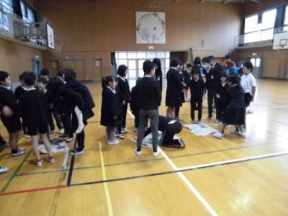 朝の児童集会の様子です。今日は、「新聞のりゲーム」をしました。各グループに分かれ、何人新聞の上に乗れるかというゲームです。新聞の大きさも小さくなっていきます。はじめは余裕がありましたが、途中からは、友達をおんぶしたり、片足で立ったりして工夫していました。