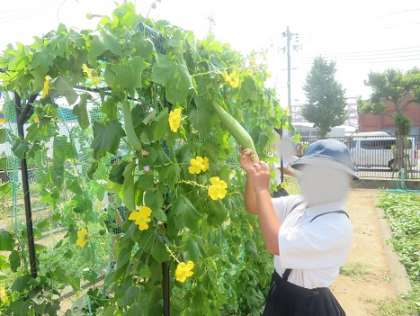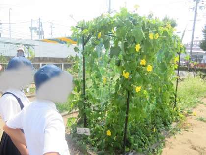 子どもたちは、夏休みが明けてヘチマが大きくなっていることに驚き、嬉しそうな様子でした。