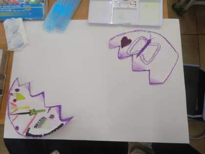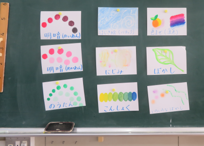 「ふしぎなたまご」の学習をしました。たまごから生まれる楽しいものやお話を想像して、形や色を考えて表現しました。子どもたちは楽しみながら一生懸命描いていました。形や色がそれぞれの想像したことを表していて面白い作品になっていました。