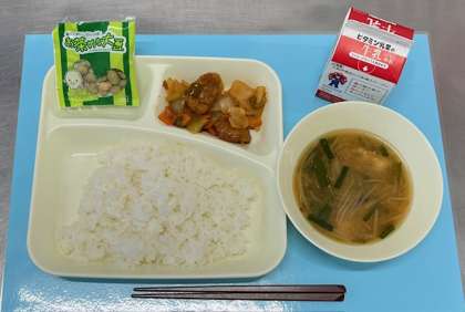 今日の給食の酢豚は、豚肉の他に、たまねぎ、たけのこ、にんじん、ピーマンを使っています。ケチャップや米酢などで味付けをしています。