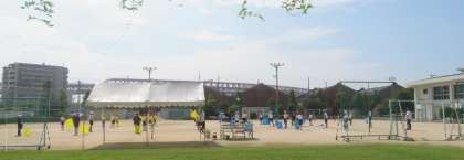 5,6年生が運動会で披露するダンスの練習を運動場で行いました。大きな旗を一斉に振ると、きれいに揃った音と共に運動場が一気に黄色と青の鮮やかな色に変わります。子どもたちは動きを合わせようと一生懸命に取り組み、練習を重ねるごとに演技が磨かれています。