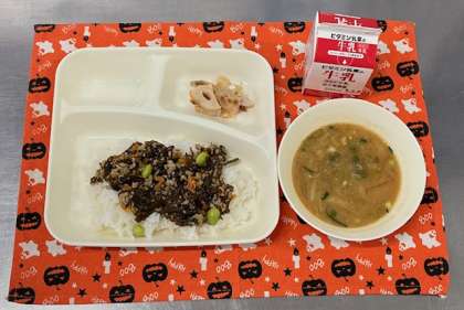 給食の「もずくと豚ひき肉のジューシー」は、豚ひき肉、にんじん、むきえだまめ、もずく、切りこんぶなどを使った、炊き込みご飯風です。
