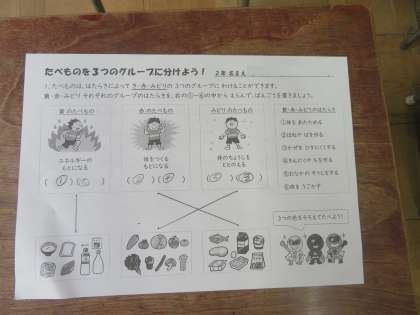 2年生は「たべものを3つのグループに分けよう!」の学習をしました。それぞれの食べ物の働きを紙芝居で知った後、自分たちで3つのグループに分ける活動をしました。食材が何からできているかを考え、色分けすることができました。