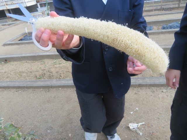 授業の終わりには枯れて硬くなったヘチマを使ってたわしを作りました。