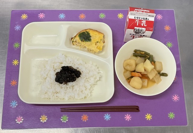 今日の給食の「卵の千草焼き」は、鶏肉、とうふ、コーン、みつばが入っています。材料、だし、鶏卵(液卵)をミニバットに入れ焼き物機で焼いています。