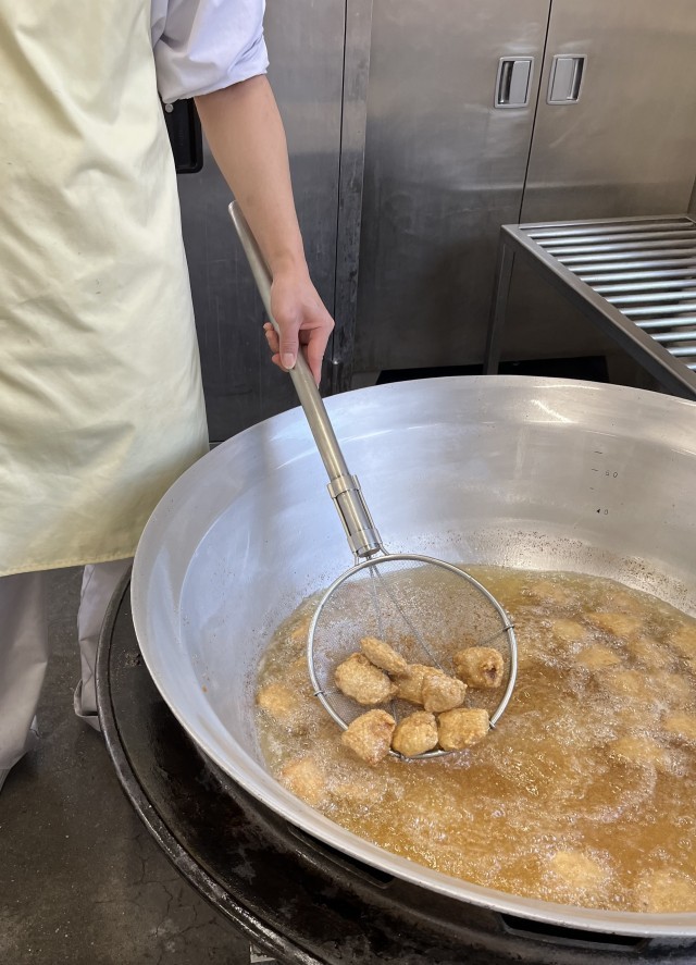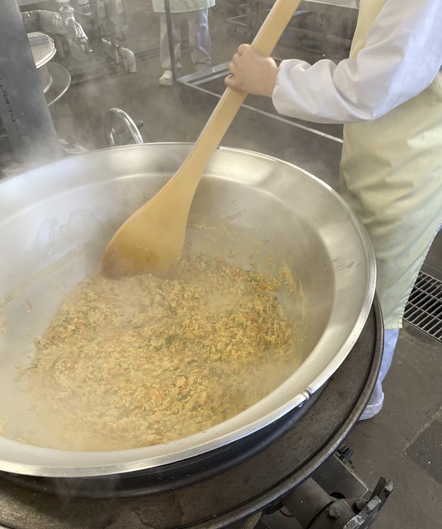 給食では、けずりぶしでとっただしで、たまねぎ、にんじん、青ねぎを煮て、調味料で味付けします。最後に卵を流し入れて作った具をご飯にかけ、さらにトンカツをのせて食べます。児童に大変人気のある献立です。