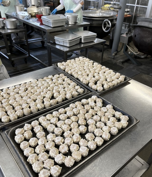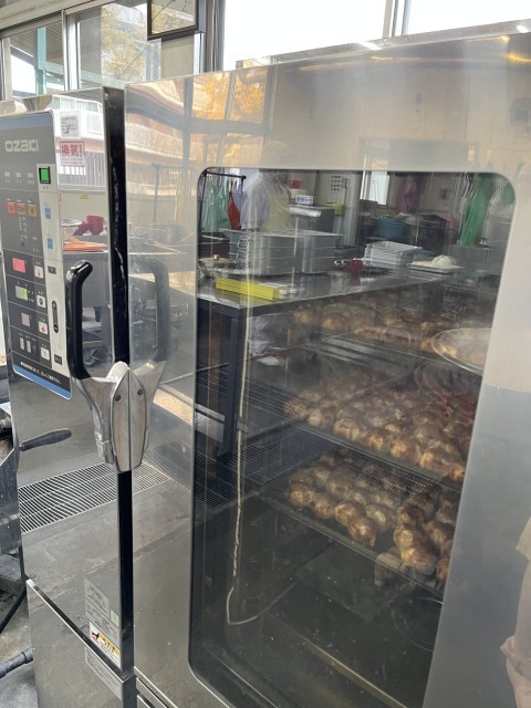 「焼きシューマイ」は、冷凍の肉シューマイをホテルパンに並べて、焼き物機で焼きます。人気のある献立で、子どもたちも喜んで食べていました。
