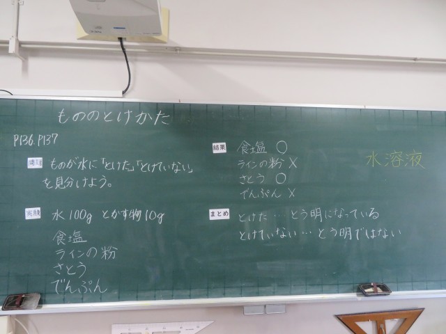 今日は、ものが水に「とけた」「とけていない」を見分ける学習をしました。食塩、石灰、砂糖、でんぷんの4種類の粉を水に溶かして調べました。子どもたちは協力して実験することができました。