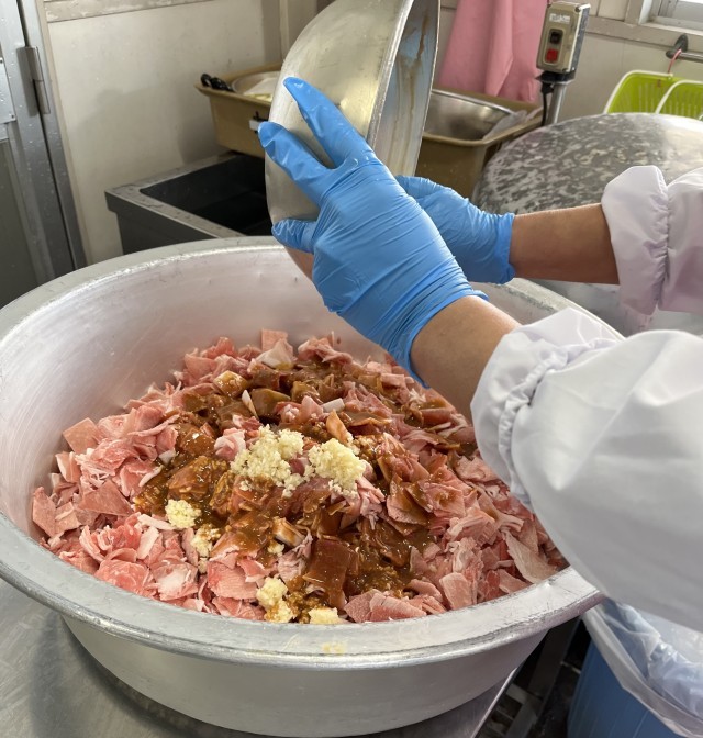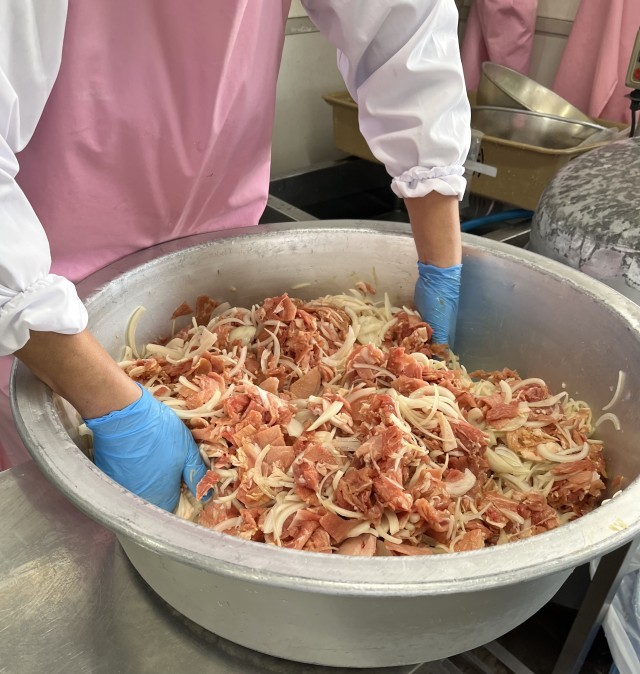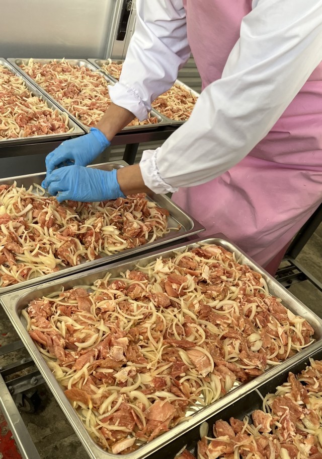豚肉ににんにく、砂糖、こいくちしょうゆ、白みそで下味をつけ、たまねぎを混ぜ合わせ、焼き物機で焼きます。