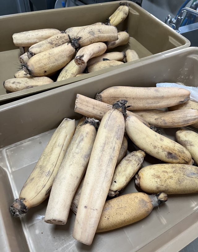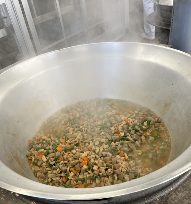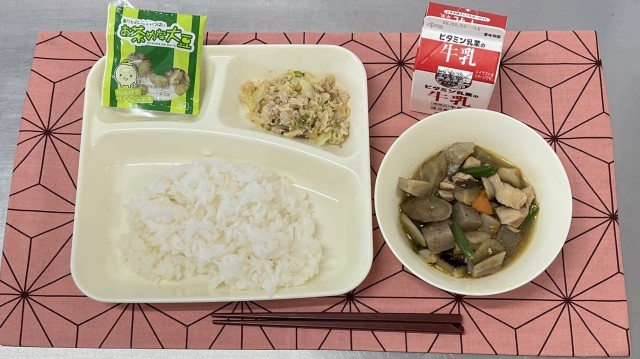 今日の給食の「筑前煮」は、鶏肉、こんにゃく、れんこん、ごぼう、にんじん、さんどまめ、しいたけを炒めてから、だしを加えて煮込み、味がよくしみこむように仕上げています。