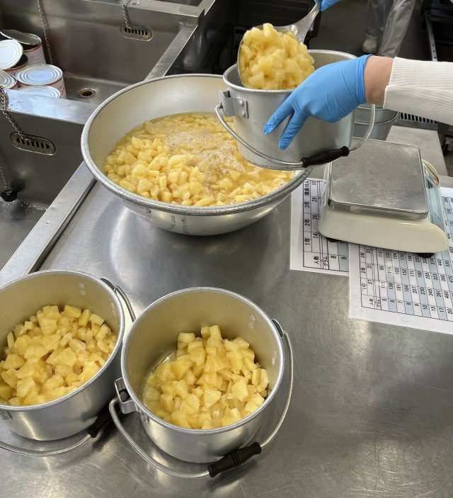 今日の給食には、食べやすくカットされたパインアップルが登場しました。