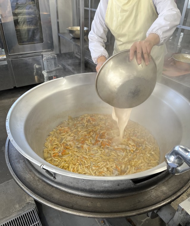 今日の給食のかす汁は、豚肉、つきこんにゃく、うすあげ、だいこん、にんじん、青ねぎが入っています。