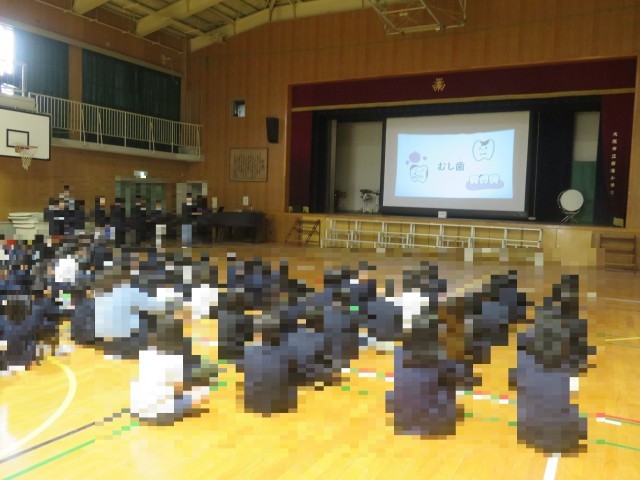 今日は、児童集会の時間に保健環境委員会の児童による「歯と口の健康について」の発表がありました。