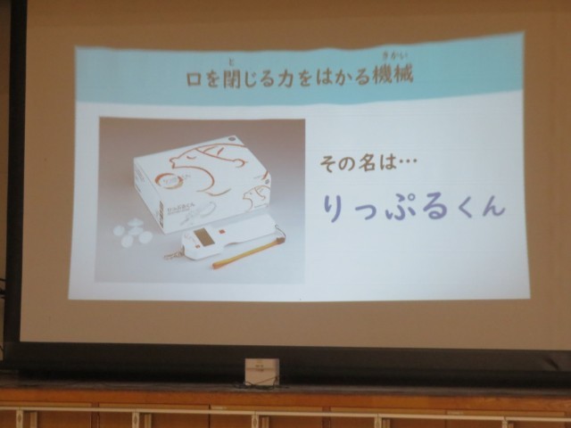 その後、以前、築港中学校の保健委員会と一緒に取り組んだ、自分の歯を守るために必要な力を測る3つの機械「健口(けんこう)くん」「歯磨き圧測定器」「リップルくん」の説明がありました。子どもたちは中学生から学んだことをしっかりと伝えることができました。