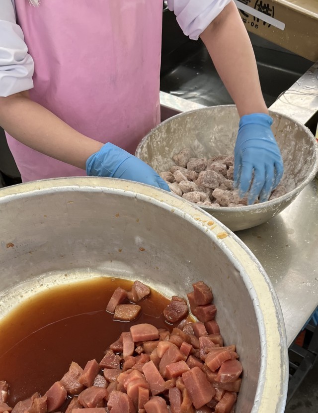 今日の給食の「豚肉のたつたあげ」は、しょうが汁、料理酒、こいくちしょうゆで下味をつけた豚肉にでん粉をまぶし、風味よく揚げています。