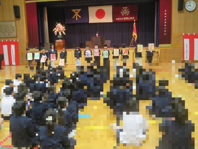 最初に校歌を斉唱した後、1年間を振り返って1年生の代表2人と4年生の全員が発表を行いました。 1年生は「この一年間で頑張ったこと」をテーマに、学習や行事の思い出を作文に込めて読み上げました。4年生は、一人一人がこの一年を象徴する「漢字一文字」を掲げ、頑張ったことや楽しかったこと、そして「こんな5年生になりたい」という抱負を発表しました。