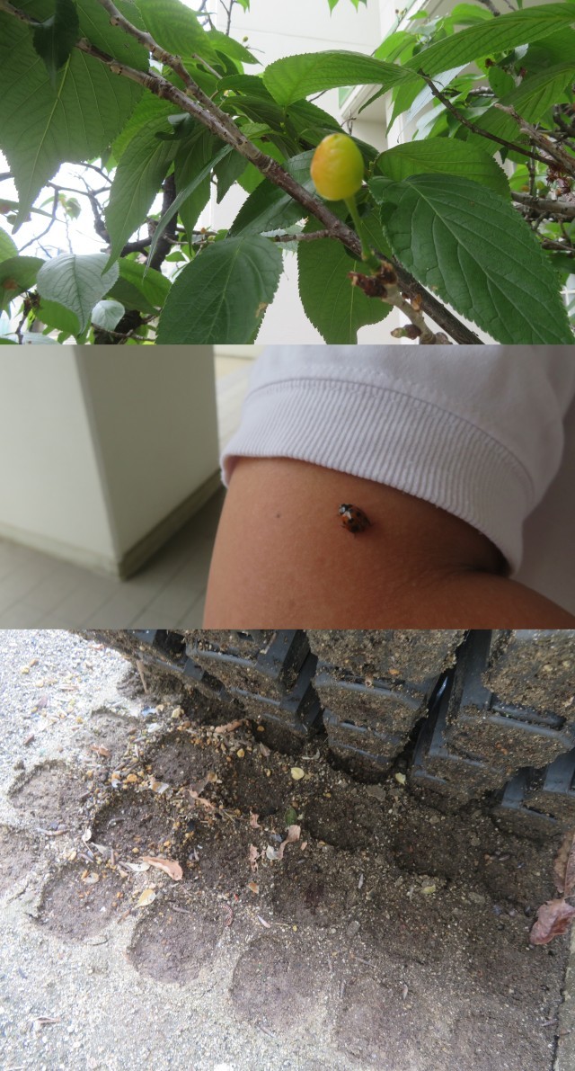 体育が終わった5年生の腕にテントウムシがとまっていたり、木にはサクランボのような実がなっていたりします。