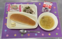 《今日の献立》豚肉と野菜のソテー、スープ、スイートポテトコッペパン、バター、牛乳...