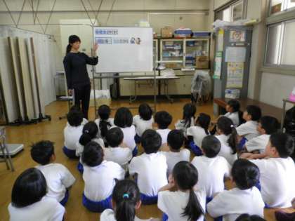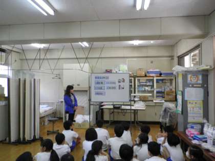 1年生は入学後、初めての測定で保健室での並び方や、「保健室の約束」のお話をききました。体育座りで背筋を伸ばして、しっかりお話をきくことができていました。