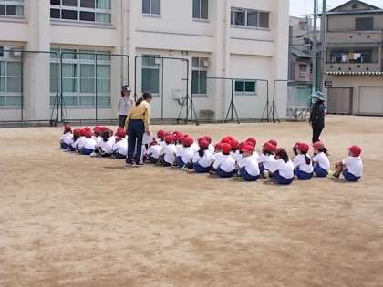そのあと、来週から休み時間に運動場に出て遊ばせますので、「遊んでいい範囲」の場所を歩いて確認しました。