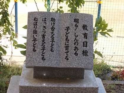 玄関の入ったところの教育目標、「明るくしんのある子どもに育てる」のあとに書かれている「助け合える子ども」を例に挙げ、