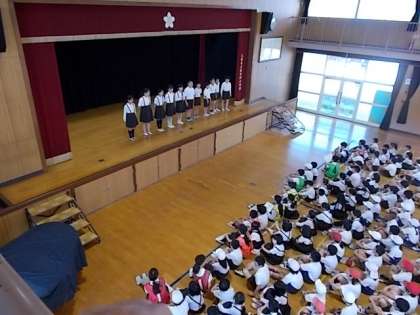 去年と違って今年の並び方は、ふれあい班ごとに、講堂の前後に分かれて並びます。ゲームをするときに、スムーズに入っていけるからです。【写真2枚目】