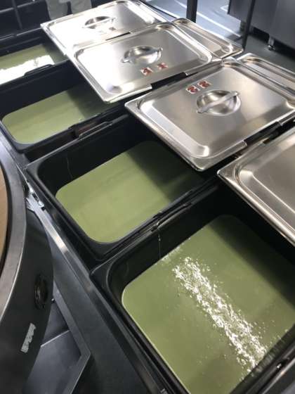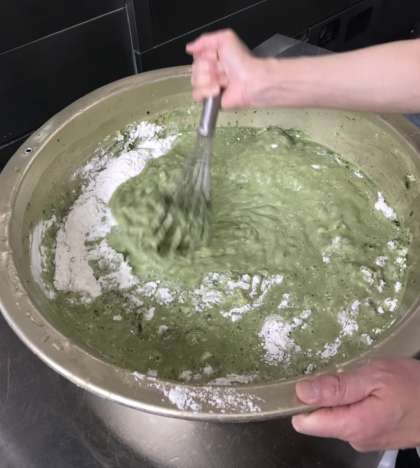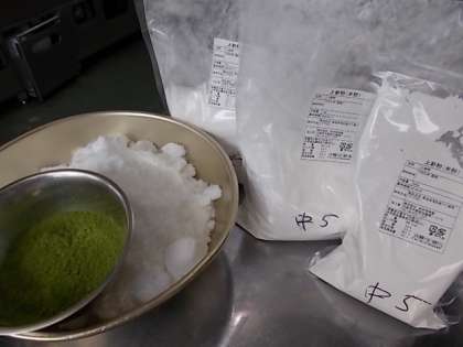 写真は、中学校266人分の上新粉と砂糖・抹茶です。(小学校も265人なので、同じ量です。)ここに白いんげんのペーストと水を加えて混ぜ、クラスごとに分け、蒸して作ります。