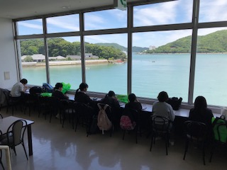 こんないい席で食べてる班もありました。 左に見えるのが、真珠島です。