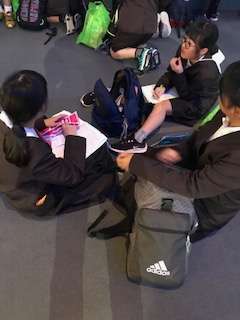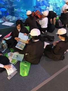 集合まで30分ありますが、エントランスホールに集まって、こづかい帳に記入しています。