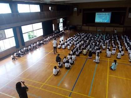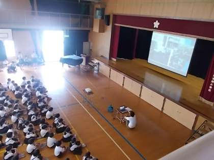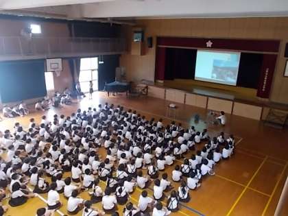下級生はじっと、スクリーンを見つめながら6年生の話を聞いていました。