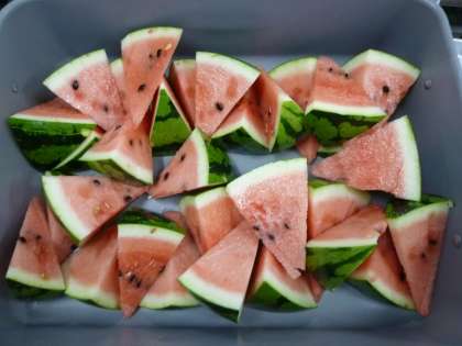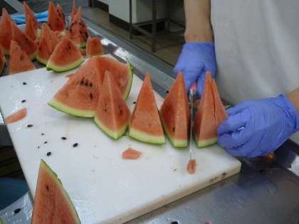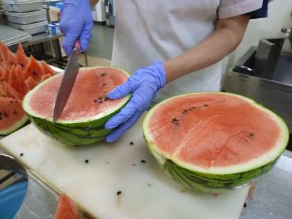 大きなすいかを、給食調理員さんが、64分の1に切ります。