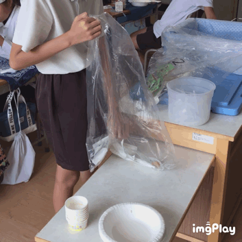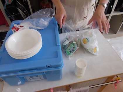 給食室では片付けもできませんので、紙皿、包装用紙、プラスプーンなどは、すべて分別回収となります。ところが、普段の分別とは少し違うやり方でした。