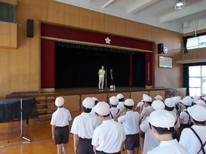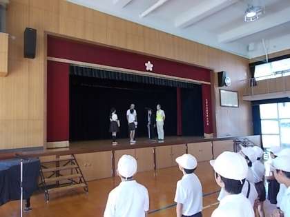 子どもたちが地域のおじいさん、おばあさんに書いた手紙(約500通)を、南市岡寿成会副会長の大野さんと、女性会会長の喜多さんに6年生の代表児童から手渡しました。
