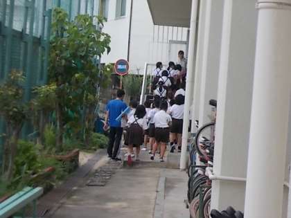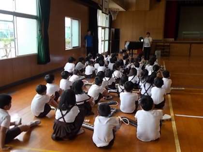 16日(祝)の本番どおり、講堂の外の非常口から入場し、緞帳が下がった状態から練習しました。